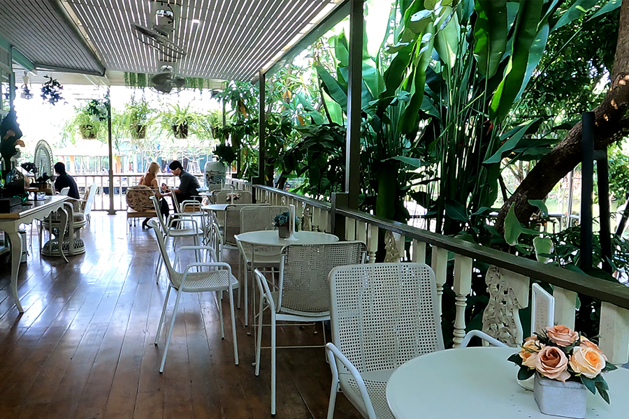มารับประทานอาหารที่นี่บอกได้เลยว่ายาวๆ ไป คือต้องจัดสรรเวลาให้ยาวๆ หน่อย เพราะเราจะใช้เวลากับที่นี่อย่างเต็มอิ่มเต็มที่กันเลยทีเดียว พอมาถึงร้านเลือกที่นั่งในร้านอาหารได้ 2 อย่าง คือ จะเลือกนั่งในห้องแอร์เย็นฉ่ำ หรือนั่งกินข้าวกันชิวๆ ในสวน ซึ่งให้บรรยากาศที่แตกต่างกันให้ความสุขและสะดวกสบายกันคนละแบบ ขึ้นอยู่กับความชอบส่วนบุคคล หากแวะไปวันทำงาน จันทร์ถึงศุกร์ก็จะเลือกที่นั่งได้ แต่หากเป็นเสาร์ อาทิตย์ หรือวันหยุดพิเศษ ร้านจะคึกคักเต็มไปด้วยลูกค้า ก็ต้องทำใจเรื่องที่นั่งกันหน่อย อาจจะเลือกไม่ได้ ต้องนั่งตามคิวการจัดที่นั่งว่างให้ลงตัวของทางร้าน