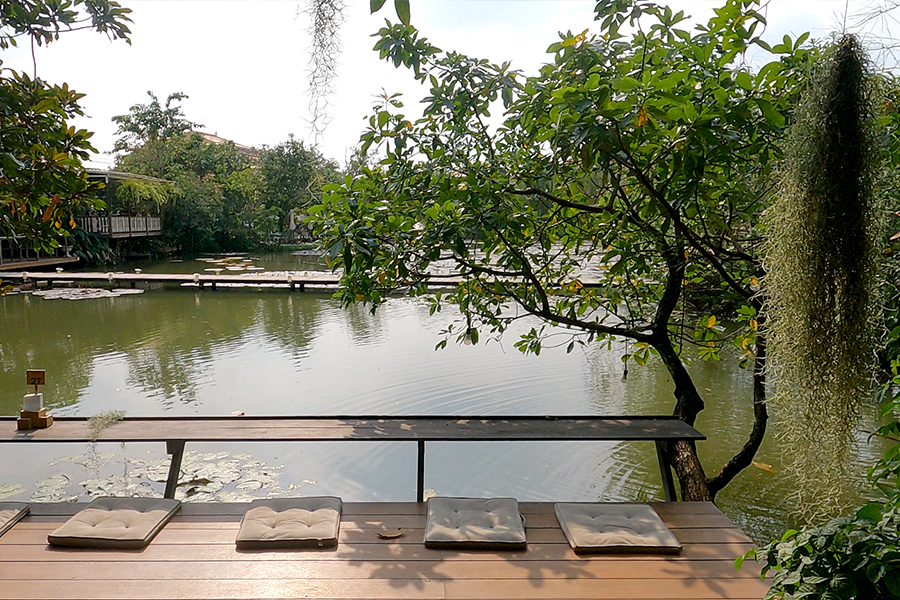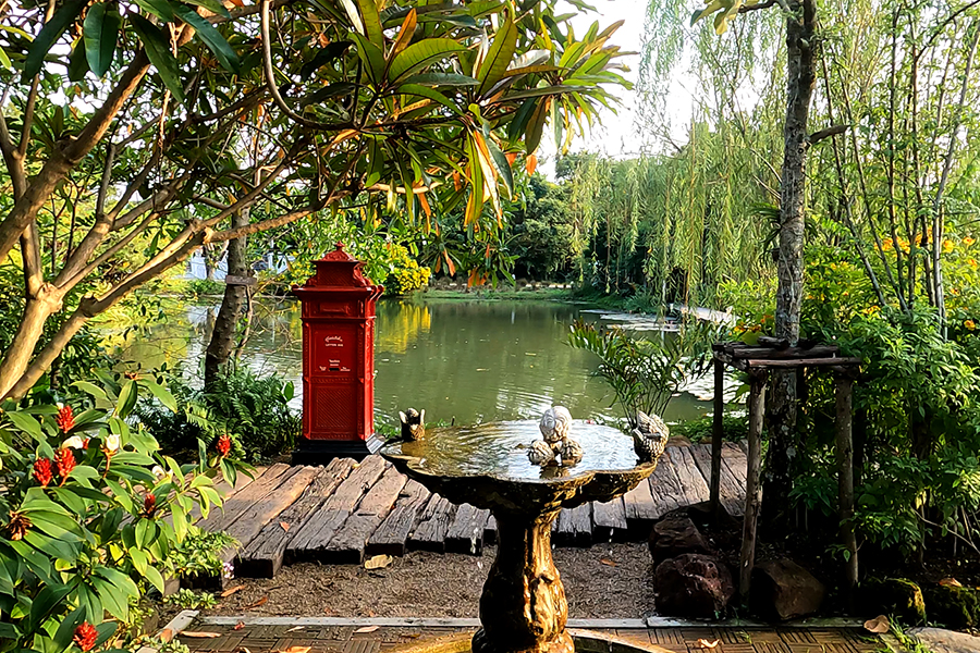 เมื่อเดินข้ามสะพานยาวที่ทอดตัวเหนือบึงกว้าง พอมาถึงก็ได้รับการต้อนรับจากต้นไม้ร่มครึ้ม และอ่างน้ำตกสามชั้นที่มีน้ำพุชุ่มฉ่ำพวยพุ่งเบาๆ แล้วไหลรินสู่แอ่งชั้นล่าง ได้ทั้งสัมผัสความสวยงามร่มรื่นด้วยสายตา ทั้งยังได้ยินเสียงไหลรินของสายน้ำต่อเนื่องกันตลอดเวลา หามุมเงียบๆ ที่ทางร้านกาแฟได้จัดไว้หลากหลายมุม สั่งเค้กพร้อมเครื่องดื่มที่ถูกใจมานั่งจิบ ก็สามารถนั่งปล่อยอารมณ์ได้อย่างยาวนานทีเดียว