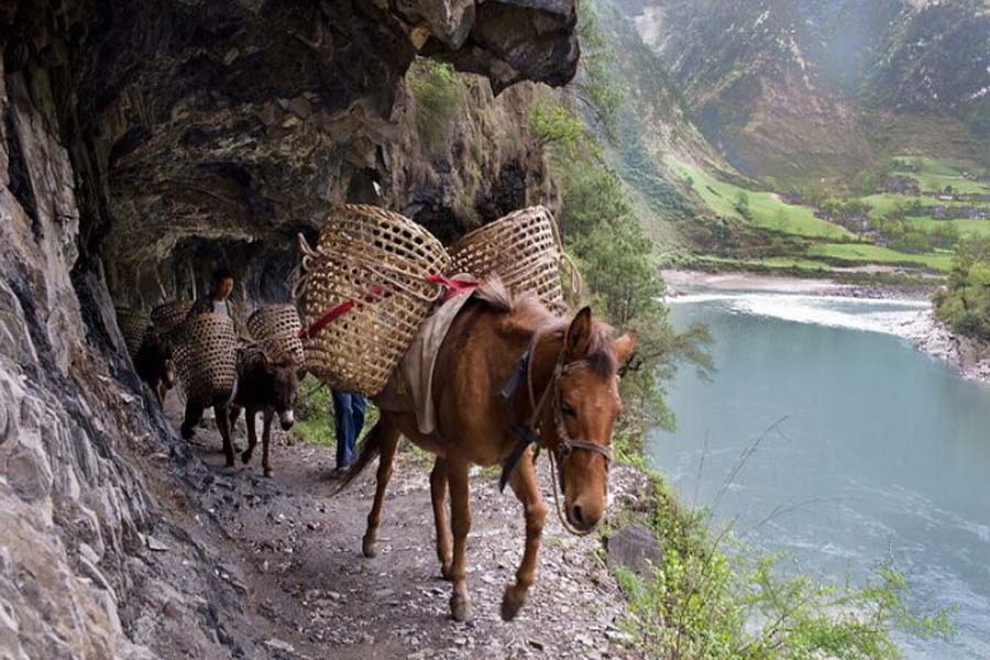 Ancient Tea-Horse Road ถนนชา-ม้าโบราณ (ในประเทศจีน) เป็นเส้นทางการค้าผ่านยูนนาน เสฉวน และทิเบตเป็นหลัก ตั้งแต่ศตวรรษที่ 6 ถึงศตวรรษที่ 20 ผู้คนในมณฑลเสฉวนและยูนนานเดินเท้าและขี่ม้ากับฝูงม้าเพื่อแลกชา เป็นถนนสำหรับม้ากับผู้คนจากทิเบต ทางเดินนี้จึงถูกเรียกว่าถนนทีฮอร์ส เมื่อยืนอยู่บนถนน จะยังคงมองเห็นร่องลึก 70 ซม. ในแผ่นหินที่เกิดจากการเหยียบกีบม้าตลอดหลายศตวรรษ ทั้งมีแท่นบูชาเก่าแก่ริมถนนจารึกคัมภีร์และคติทางศาสนาอย่างหลากหลาย ถนนโบราณทีฮอร์สเป็นถนนเก่าแก่ที่สูงชันและสูงชันที่สุดแห่งหนึ่งในโลก ซึ่งได้นำพาอารยธรรมและวัฒนธรรมมาเผยแพร่มานานหลายศตวรรษ