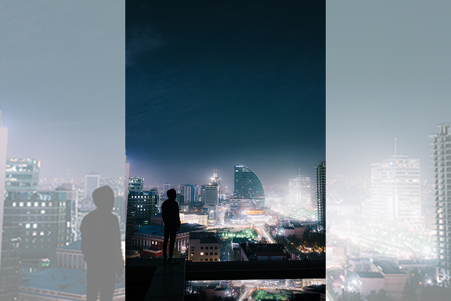 ที่จัตุรัส เช่งจิส กลางเมือง ด้านหนึ่งของลานมีรูปสลักหินขนาดใหญ่ของ ‘ข่าน’ คนสำคัญในหน้าประวัติศาสตร์มองโกเลีย และลานกว้างแห่งนี้ยังแวดล้อมด้วยตึกสูงทรงทันสมัยแปลกตาของสำนักงานบรรษัทข้ามชาติ เสมือนเป็นสถานที่ซึ่งโลกเก่าและโลกใหม่ได้มาบรรจบกัน เมืองหลวงของมองโกเลียมีทิวทัศน์ที่ปลอดโปร่งโล่งตา สามารถเห็นสวนสาธารณะหรือพื้นที่เปิดโล่ง ขณะที่อีกฝั่งก็เป็นแนวอาคารร้านค้า ผู้คนดูไม่จอแจมากนัก ตึกสูงจะกระจุกตัวอยู่ในย่านกลางใจเมือง ที่เลยเมืองออกมาไม่เท่าไรก็จะมีภูเขาและท้องฟ้าสีฟ้าเข้มสวยงามนัก
