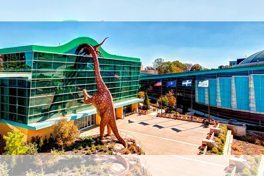 ความสนุกของพิพิธภัณฑ์แห่งนี้เริ่มต้นจากด้านนอกเลย นักท่องเที่ยวที่มาถึงจะต้องตื่นตะลึงกับไดโนเสาร์พันธุ์แบรคิโอซอรัส (Brachiosaurus) ขนาดเท่าของจริง ที่ยืดคอยาวขึ้นไปดันหลังคาอาคาร แล้วยังใช้สองขาหน้าทำท่าปีนป่าย เหมือนพยายามจะเปิดหลังคาพิพิธภัณฑ์ให้ลูกของมันได้เข้าไปเที่ยวข้างในกับเด็กๆ ไดโนเสาร์ประเภทนี้มีขาหน้ายาวกว่าขาหลัง ทำให้มีคอที่ตั้งสูง สำหรับการกินยอดไม้ในที่สูง การที่มีไดโนเสาร์กำลังยืดคอยื่นหน้า ตะกายตึกเข้าไปดูข้างในพิพิธภัณฑ์ นับว่าเป็นความประทับใจแรกที่น่าตื่นตาตื่นใจไม่น้อย นี่แค่มาถึงก็มีเรื่องสนุกให้เด็กๆ ได้คุยกันแล้วว่า ดูสิขนาดไดโนเสาร์ยังอยากเข้าไปดูด้านใน เห็นอย่างนี้เด็กๆ ก็แทบจะวิ่งแข่งกันเข้าตึกไปเลย