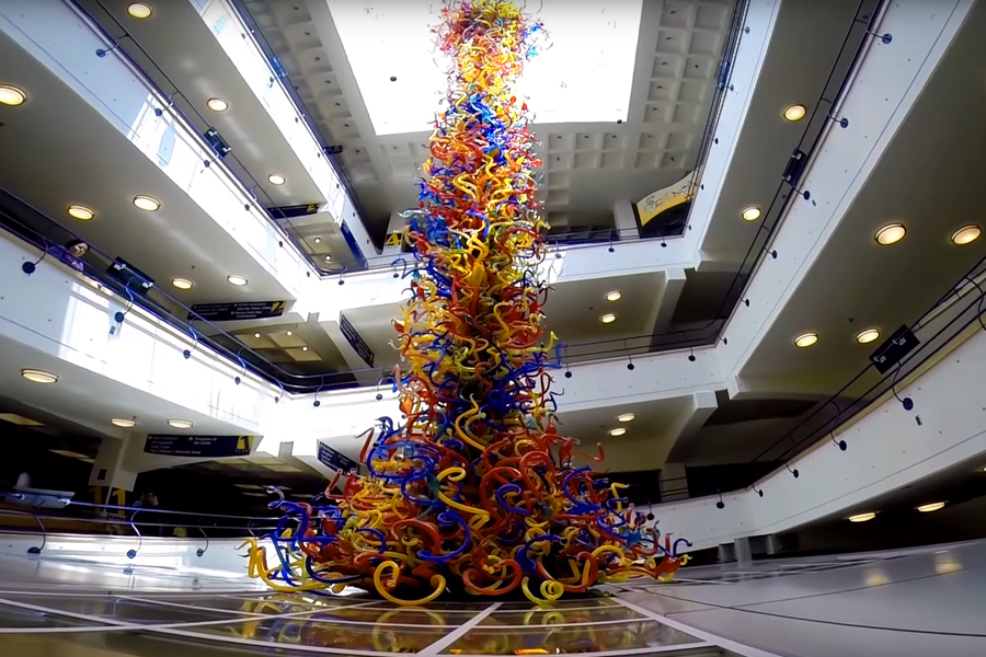 ย้อนกลับมาอีกฟากฝั่งหนึ่งของชั้น LL ตรงนี้จะเป็นส่วนของงานศิลปะที่มีสีสันสวยงาม ที่มีชื่อว่า Fireworks of Glass เป็นงานเป่าแก้วของศิลปิน Dale Chihuly ที่นอกจากจะสวยแล้ว ยังมีขนาดที่น่าตื่นตาตื่นใจ ส่วนสูงของงานชิ้นนี้มีขนาดถึง 13 เมตร เป็นมุมถ่ายรูปที่สวยมากมุมหนึ่งเพราะสีสันที่สดใส แล้วเด็กๆ ยังจะได้สัมผัสและทดลองสร้างงานศิลปะของตัวเองได้ด้วย เพราะที่มุมนี้จะมีแบบจำลองแก้วเหมือนในชิ้นงานที่จัดแสดงอยู่ แต่ของเด็กจะทำจากพลาสติกใส เพื่อให้พวกเขาได้ใช้ต่อเติมจินตนาการของตัวเอง สร้างสรรค์เป็นผลงานศิลปะตามแบบของ Chihuly แต่ทำในสไตล์ของตัวเอง มุมนี้ค่อนข้างเงียบสงบ จัดว่าเป็นมุมพักผ่อนหย่อนใจให้กับผู้ปกครองได้ดีทีเดียว
