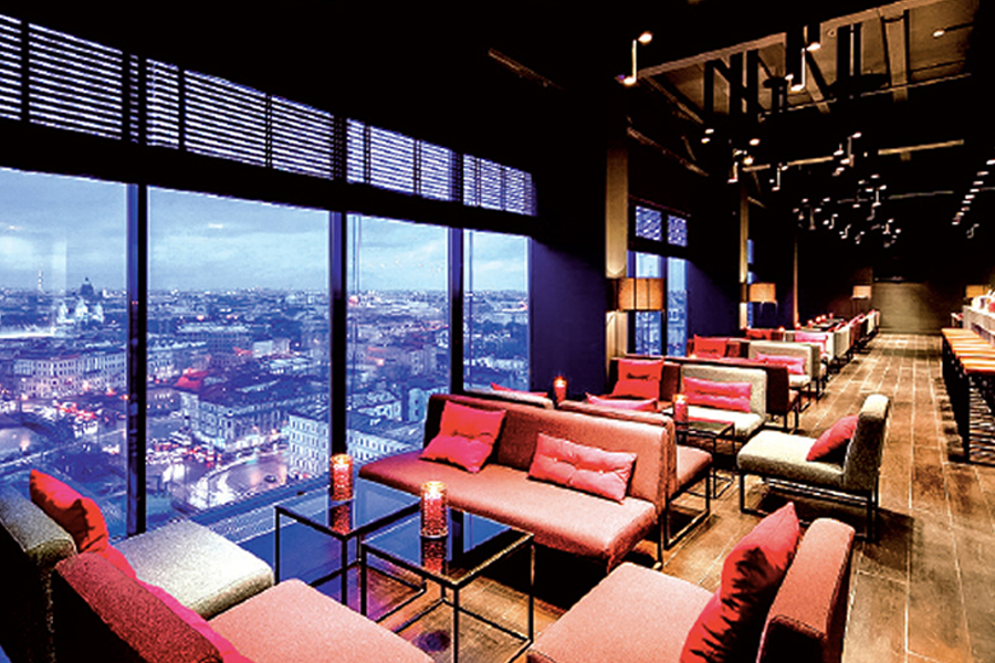 ก่อนตะวันจะลับขอบฟ้า ได้ขึ้นลิฟต์ไปที่ Azimut Sky Bar บนชั้น 18 ของโรงแรมอซิมุท ที่มีกระจกล้อมรอบมิดชิด ได้ชมภาพพาโนราม่าของเมืองที่ได้ชื่อว่า มีความเป็นตะวันตกที่สุดของรัสเซีย มองจากเหนือโค้งแม่น้ำฟอนแทนก้า (Fontanka River) เห็นวิหารตรินิตี้โดดเด่นสวยจับใจ นั่งเพลินจนพลบค่ำ เครื่องดื่มราคาเบาๆ แต่บาร์เทนเดอร์มือหนักมาก บริกรสาวสวยคงเห็นเราไม่สันทัดภาษารัสเซี่ยน แต่สนใจ Happy Hours เหลือเกิน ก็แนะนำประสาคนอัธยาศัยดี มีโปรโมชั่นอะไรบอกหมด ยกให้เป็นมุมประทับใจที่ต้องกลับมาซ้ำแน่นอน