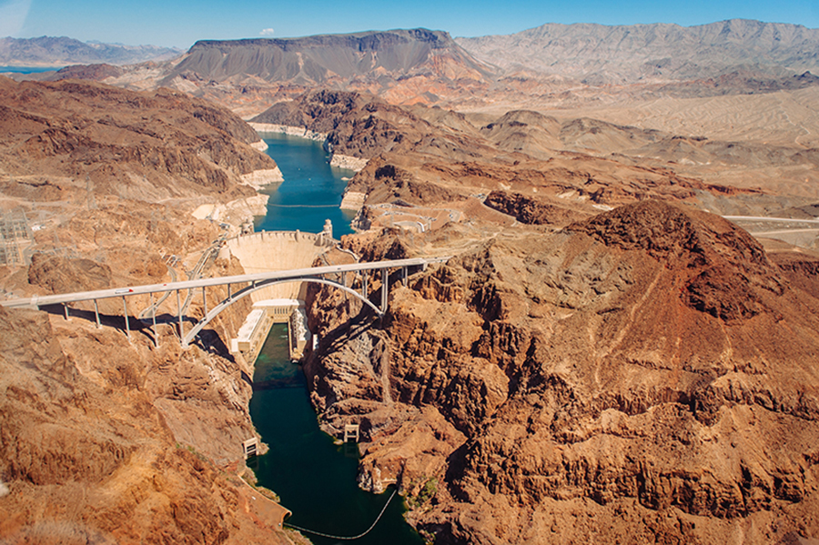 ในอดีต เพื่อแก้ปัญหาทางด้านอุทกภัยระหว่างชายแดนของรัฐแอริโซนาและรัฐเนวาดา ทางออกคือการสร้างเขื่อนขึ้นเพื่อขวางบนแม่น้ำโคโลราโดในปี ค.ศ. 1931 ส่งผลให้เกิดทะเลสาบมี้ด (Lake Mead) เหนือเขื่อนไปโดยปริยาย แรกเริ่มใช้ชื่อเขื่อนโบลเดอร์ตามสถานที่ตั้ง จนเปลี่ยนเพื่อเป็นเกียรติแด่ประธานาธิบดีเฮอร์เบิร์ต ฮูเวอร์ คนทั่วโลกจึงรู้จักในนามเขื่อนฮูเวอร์ ซึ่งถือเป็นการสร้างประวัติศาสตร์หน้าใหม่ให้แก่วงการวิศวกรรมในฐานะเขื่อนใหญ่ที่สุดในโลก ณ ช่วงเวลานั้น ด้วยความสูง 221 เมตร โดยมีความหนาของฐานถึง 201 เมตร หรือราวขนาดสองสนามฟุตบอลรวมกัน