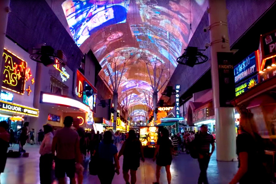 ปัจจุบันถนนคนเดินฟรีมอนต์ (Fremont Street Experience) ยังคงเต็มไปด้วยคาสิโนแบบดั้งเดิมมาตั้งแต่ยุค’40 คึกคักสุดหลังตะวันลับฟ้า แสงไฟหลายล้านดวงสาดส่องจนแทบจะไม่สามารถแยกช่วงเวลากลางวันและกลางคืนได้ คิดดูสิว่า แค่โรงแรมเดียวก็ใช้ค่าไฟต่อปีไปถึง 400,000 เมกกะวัตต์แล้ว ถึงแม้จะไม่เป็นที่นิยมในหมู่นักเดินทางรุ่นใหม่เท่า Las Vegas Boulevard หรือ Strip ถนนสายบันเทิงแห่งใหม่ใจกลางดาวน์ทาวน์ปัจจุบัน แต่เรากลับชอบมากกว่า ด้วยเสน่ห์คลาสสิกอันแสนโดนใจคนโหยอดีต โดยเฉพาะแถบโรงแรม Golden Nugget และ 4 Queens ช่างมีชีวิตชีวาเหมือนหลุดเข้าไปในโลกจอเงินของหนังคาวบอย