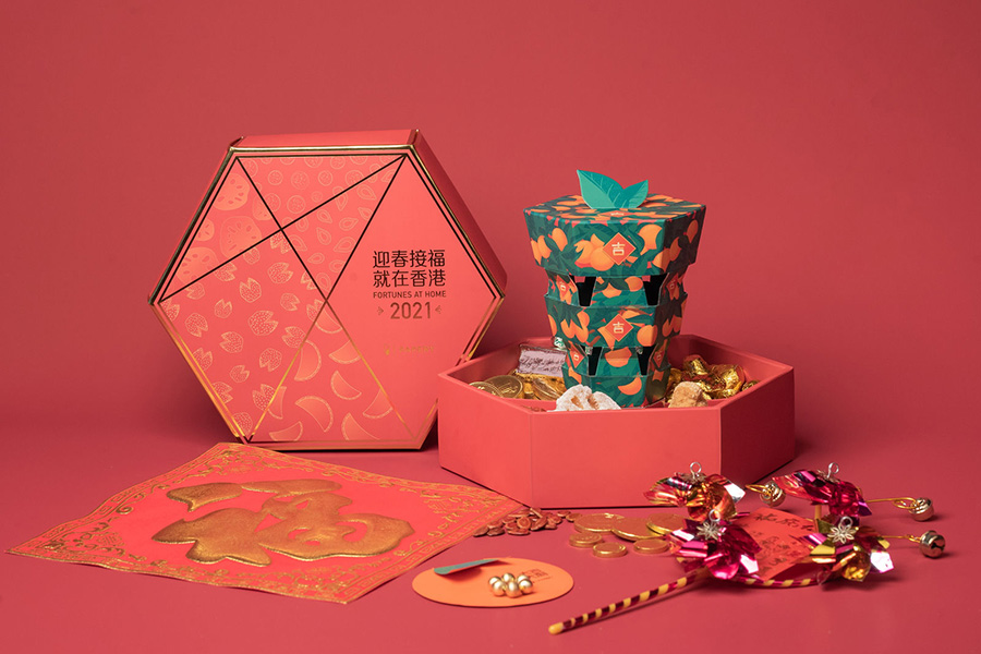ของขวัญมงคลใน "ถุงโชคดี" ประกอบด้วย "ฟ่าย ชุน” หรือป้ายอักษรจีนมงคลที่นิยมแขวนหน้าประตูบ้านและบนผนังในช่วงเทศกาลตรุษจีนเพื่อความเป็นสิริมงคล รวมถึงสร้อยลูกปัดเสริมดวงเพื่อเสริมสุขภาพให้แข็งแรงตลอดปีฉลูนี้ กังหันนำโชค และกล่องใส่ขนมมงคลซึ่งเป็นผลงานการสร้างสรรค์ร่วมกันระหว่างร้านขนมเก่าแก่ Yiu Fung กับ Papery บริษัทจัดทำสิ่งพิมพ์ที่มีไอเดียสร้างสรรค์